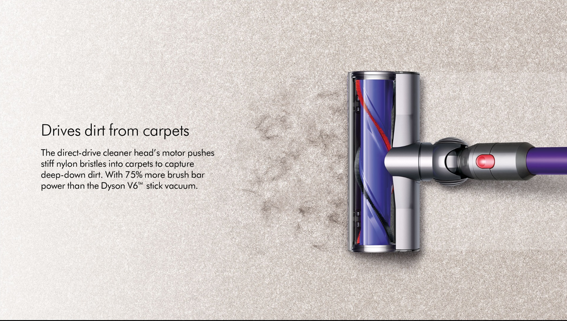 Dyson EngineeringOn the V7 Animal+, youll find powerful direct-drive technology in the cleaner head. As a result, this cordless cleaner removes stubborn dirt from carpets and hard floors with 75% more power than the Dyson V6.